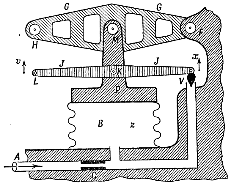 Сжатый воздух в изобилии подается в A и проходит через сужение С, после чего либо устремляется в мехи В, либо выходит в клапан V. Давление в А значительно выше обычного рабочего давления в В, а отверстие С мало, так что воздух, проходя С, движется с постоянной скоростью. После этого он должен либо выходить через V, либо собираться в В, повышая давление z. Скорость выхода воздуха в V, где отверстие частично закрыто конусом, зависит от вертикального перемещения (х) конуса. Последний прикреплен к одному из концов легкого жесткого стержня /, который может поворачиваться вокруг оси К. При неподвижной оси опускание противоположного конца L стержня J поднимет конус, что откроет выход воздуху и вызовет падение давления z внутри В; обратно, поднятие L вызовет повышение z. Давление воздуха в В противодействует тяжелому грузу В. Этот груз имеет вверху форму столба и может двигаться весь только вверх или вниз. На столбе укреплены две оси: К и М. М служит осью прочного бруса G, закрепленного в одном конце (В). Если Р поднимается, то М также поднимается на ту же высоту, а свободный конец И бруса G поднимается на высоту, вдвое большую. Посмотрим теперь, что происходит при перемещении В. Положим, что оператор поднимает L на один дюйм. Другой конец (V) при этом опускается на один дюйм, и выходное отверстие клапана уменьшается, пропуская меньшее количество воздуха, так что воздух на-чинает скопляться в В и давление z повышается. Повысившееся давление поднимет Р и тем самым М и Н. Таким образом, движения М стремятся просто повторять движения L. [Мы можем заметить, что подъем Р (если L после подъема на один дюйм фиксируется) заставит клапан V приоткрыться. Таким образом, реакция всей системы на перемещение L будет самоограничи-вающейся, ибо обратная связь здесь отрицательна. При соблюдении определенных количественных подробностей, требующих точного учета при каждом практическом осуществлении, система будет устойчива в некотором состоянии равновесия, положение которого определяется положением L.] Можно также рассматривать весь механизм как устойчивую систему, действующую таким образом, что когда перемещение В, скажем, на один дюйм будет стремиться вызвать перемещение V также на один дюйм, реакция всей системы будет стремиться аннулировать это. Иными словами, систему можно рассматривать как такую, которая стремится сохранить постоянным положение клапана V. Теперь нам видно, как превратить эту систему в усилитель мощности и использовать ее в качестве подъемного крана. Конструктор должен позаботиться о том, чтобы рычаг J был легким. Далее, клапан V должен быть устроен так, чтобы выходящий воздух, или давление г, не оказывало большого влияния на силу, прилагаемую к L. Конструктор должен также позаботиться о том, чтобы мехи В имели большую площадь соприкосновения с Р и чтобы среднее рабочее давление z было высоким (а давление в А - еще более высоким). Если это удастся, то небольшая сила, поднимающая L на один дюйм, сможет развить в Н большую силу, способную поднять тяжелый груз на такую же высоту. Так, сила в 1 фунт, передвигающая L на 1 дюйм, может заставить Н поднять на один дюйм груз в 1000 фунтов. Таким образом, система является усилителем работы (или мощности). Упр. 1. Сколько степеней свободы имеют три тела Р, J, G? Упр. 2. Измените устройство так, чтобы H, удерживая состояние равновесия